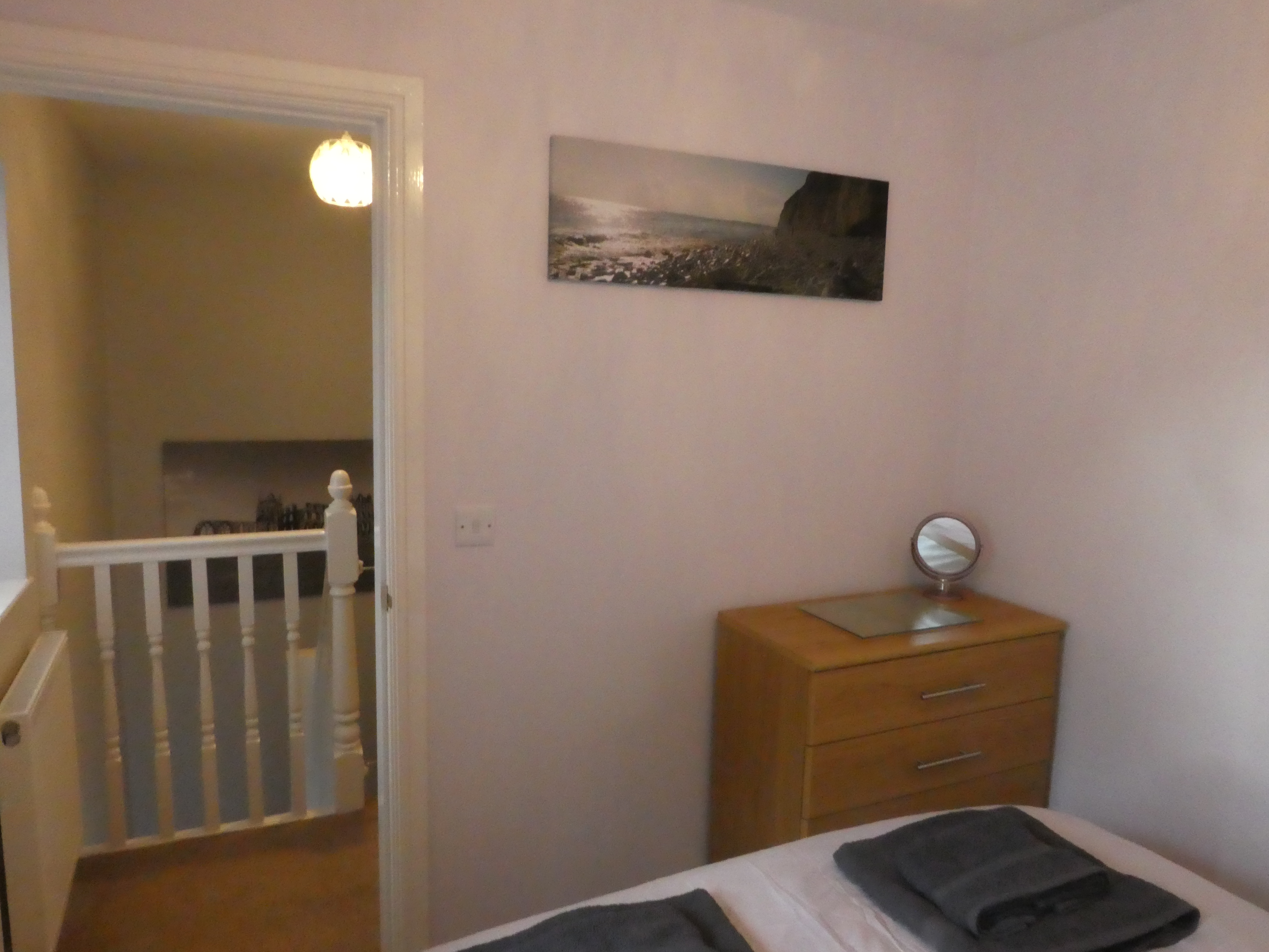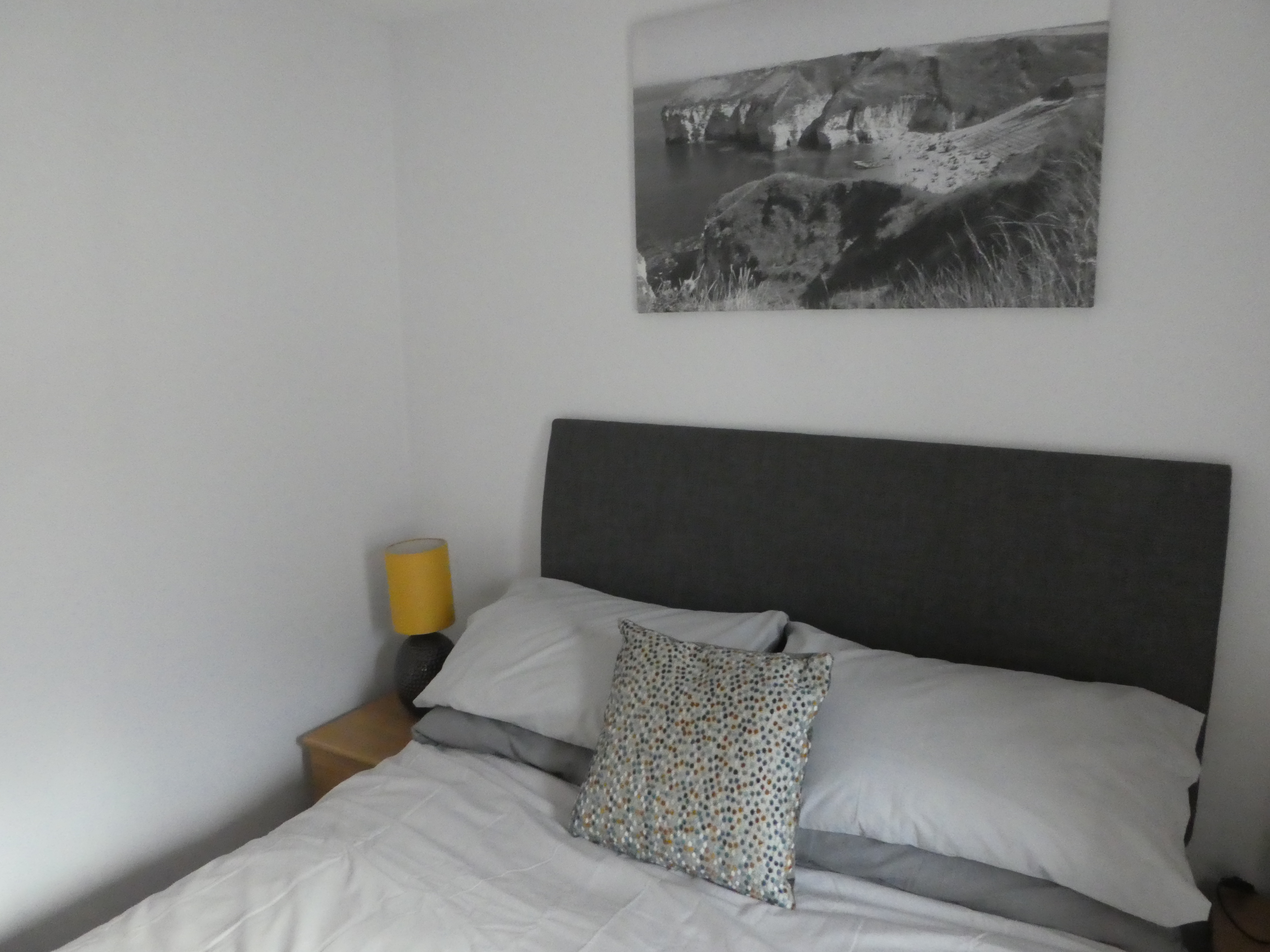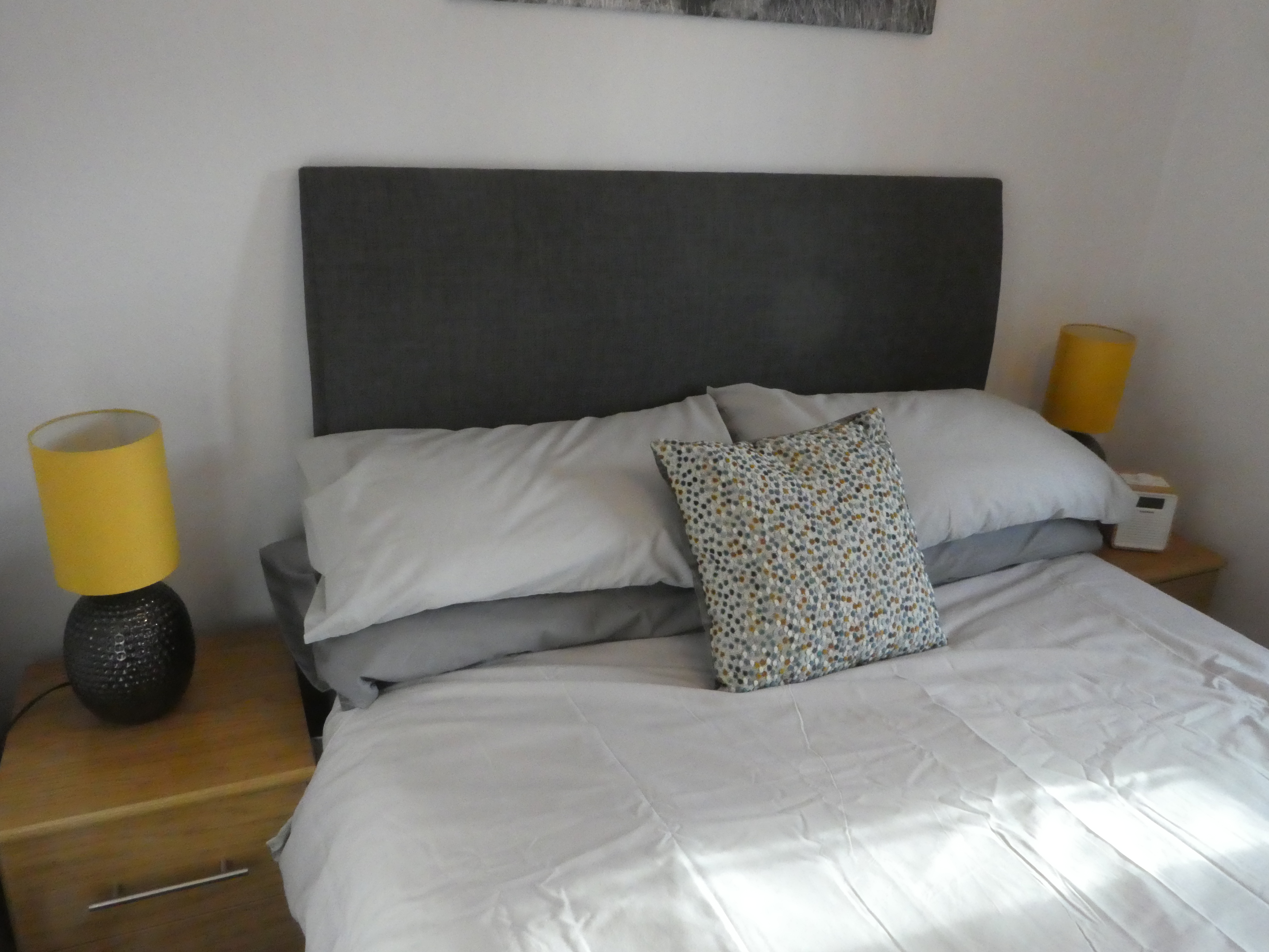 The bed is again a double, identical to Bedroom 1. Storage is provided by a two bedside cabinets and a matching chest of drawers in light oak colour. There are reading lamps on the bedside cabinets.