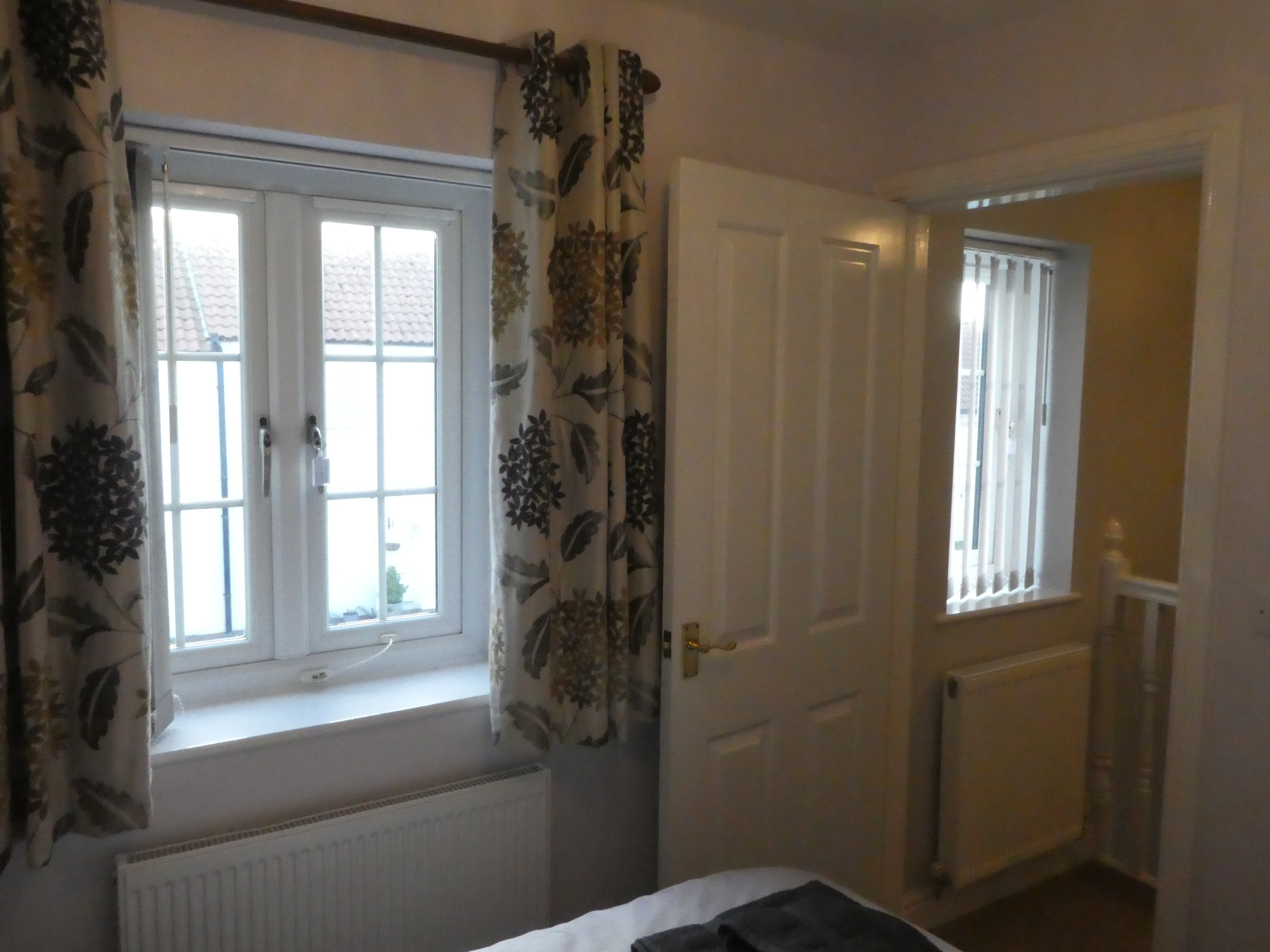 It benefits from sunlight during the later morning and early afternoon. The window has lined curtains and vertical blinds.