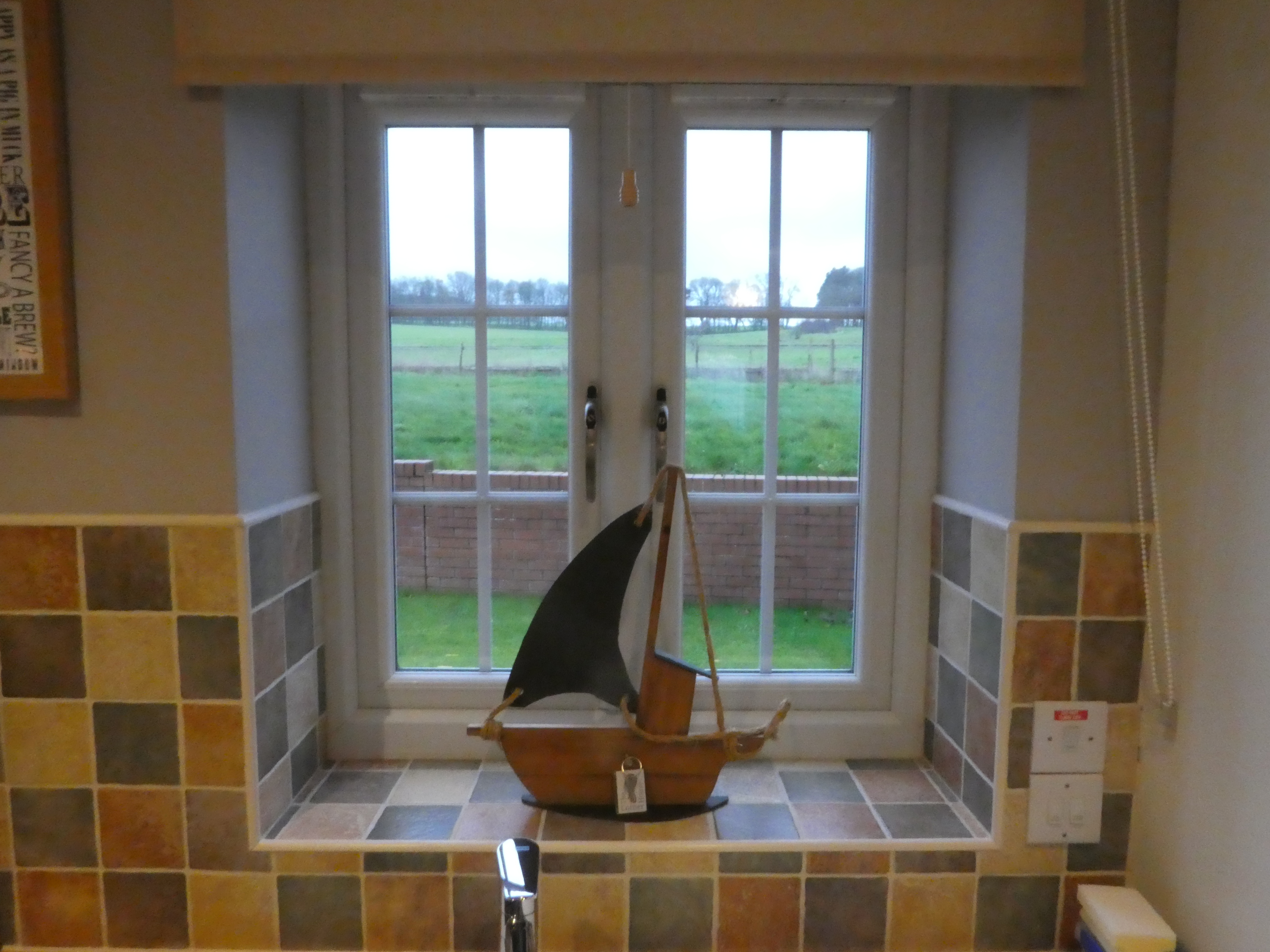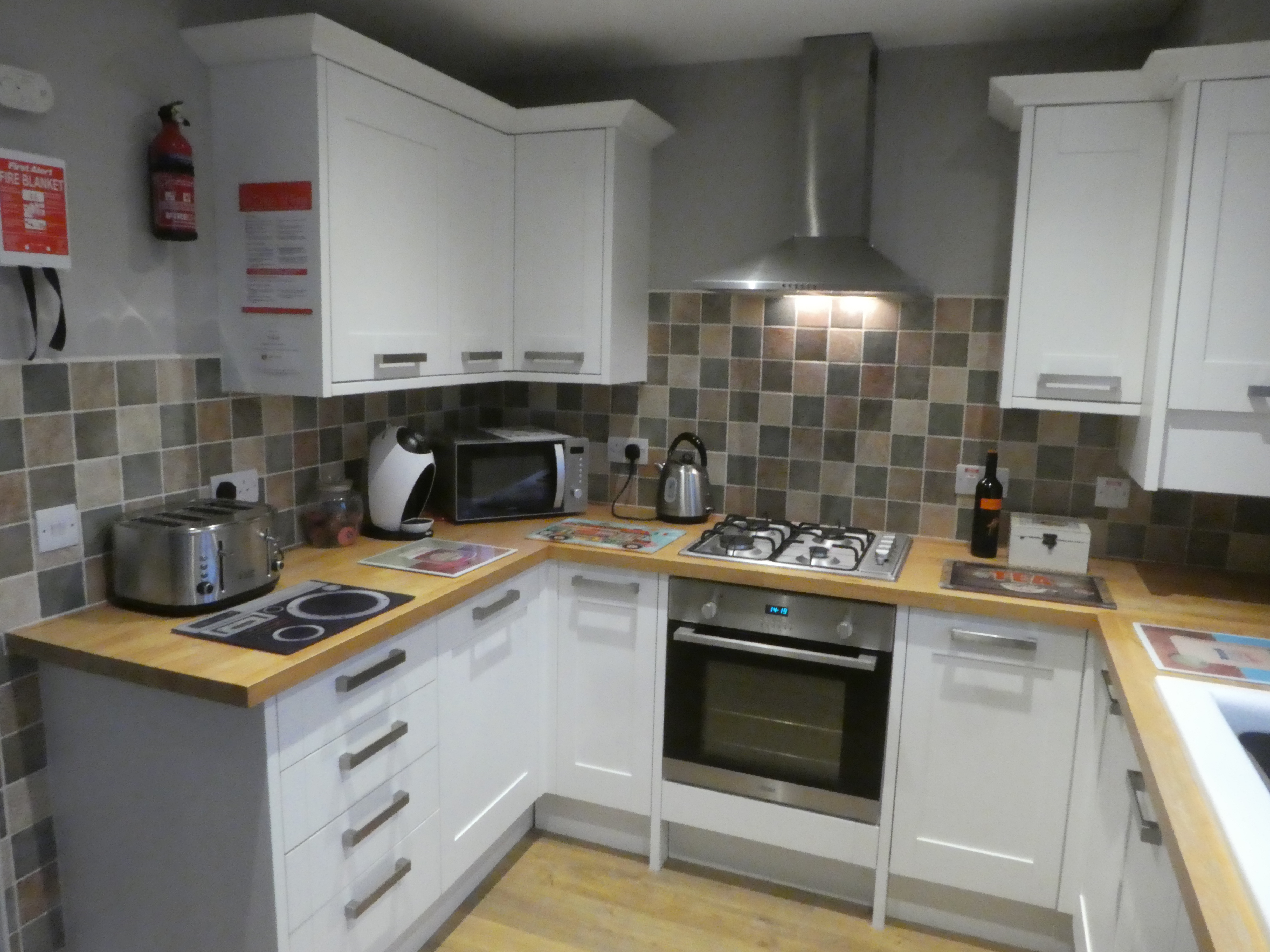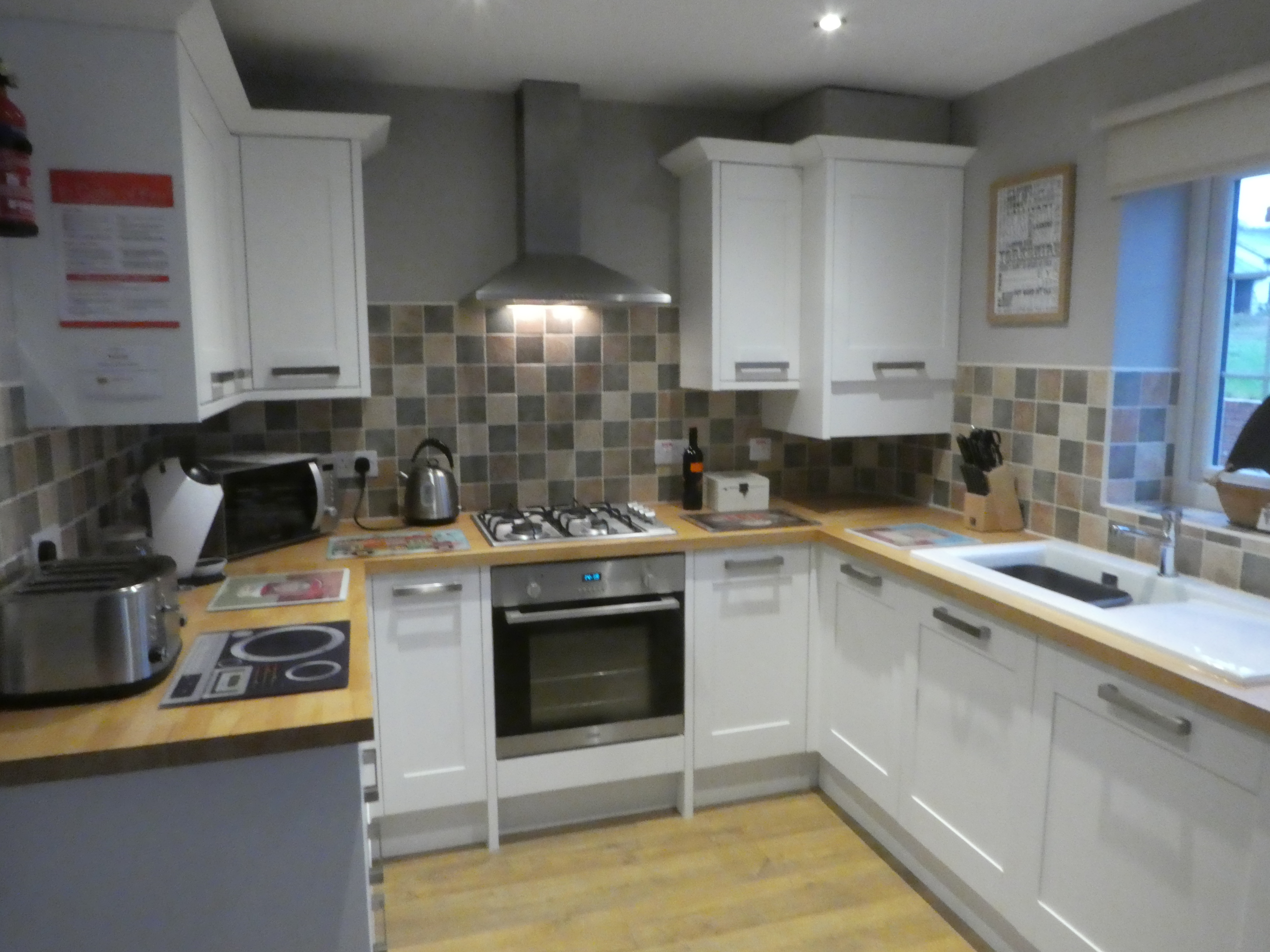 The kitchen is set out with modern fully fitted units in a U shape featuring wooden work surfaces and part ceramic tiled walls. The window gives a pleasant view to the rear. Appliances are fully integrated, including a gas hob, oven, washerdryer, dishwasher, fridge and freezer. There is also a microwave. It is fully equipped with crockery, glasses and utensils.